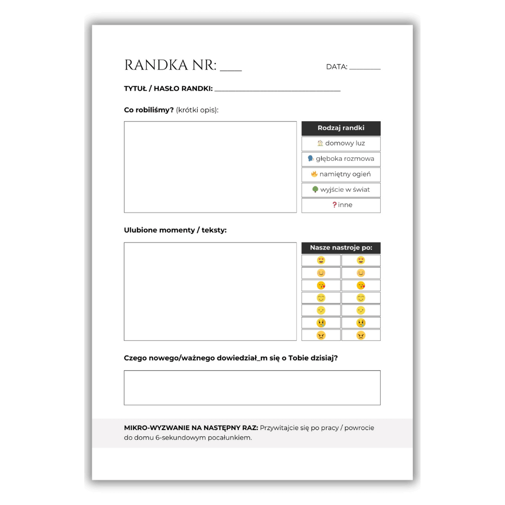 Randkownik to nie jest zwykły zeszyt. To Wasza autorska „kronika powrotów do siebie”. Miejsce, gdzie zwykły wieczór z pizzą zamienia się w ważną pamiątkę, a trudny tydzień kończy się chwilą wdzięczności.